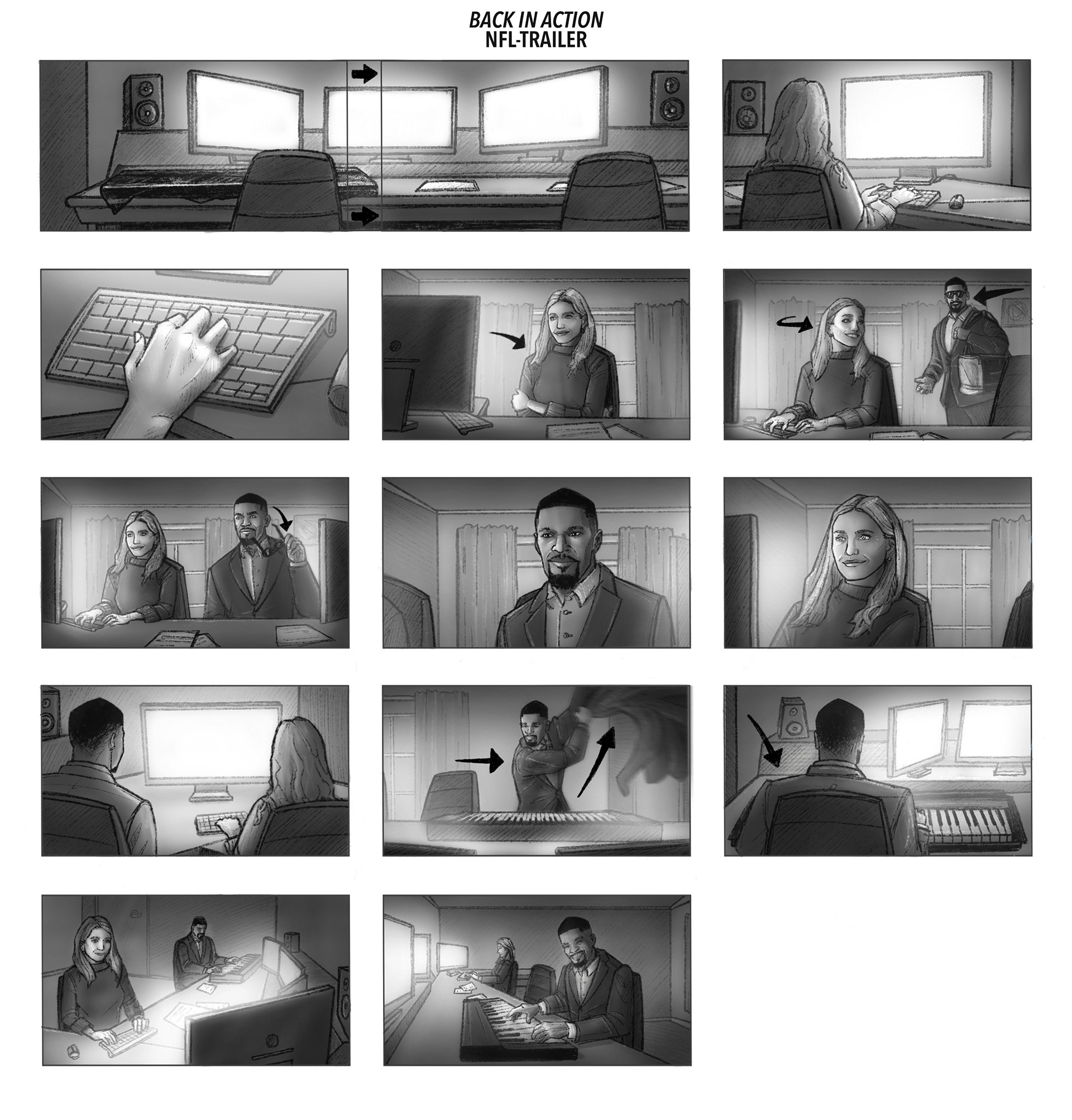 Storyboards for Netflix "Back in Action" Promotional Trailer starring Jamie Foxx and Cameron Diaz. Aired during the Christmas Day NFL Game
